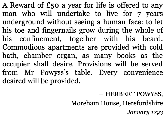 Well, he had a taker. Enter: John Warlow, a semi-literate laborer and father of 6. He agrees to the conditions (7 years, no human contact, no clipping/cutting of his hair and nails, all while journaling daily), and signs off on the papers promising him 50 pounds a year for life. Even while surrounded by books he can’t read, art he doesn’t understand, and a giant instrumental organ he never plays, for some reason, Mr. Warlow still loses his mind. Truly mind-boggling.